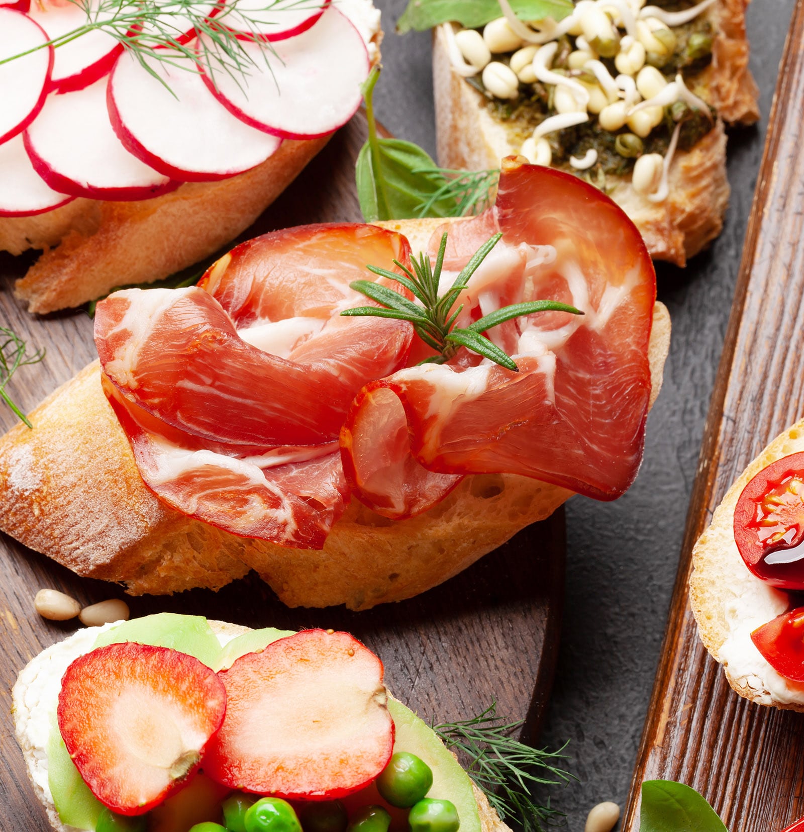 Kanapki bankietowe podane na połowie bułki katalońskiej z ziarnami, ciabaty lub bagietki
